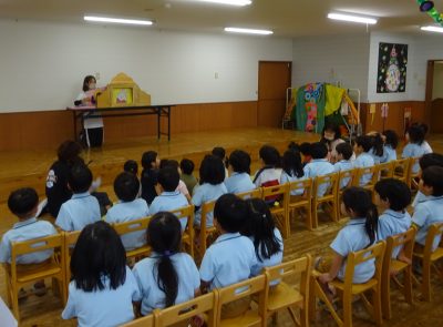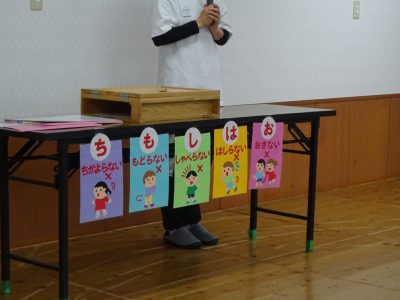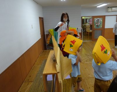 紙芝居「だいじ だいじ」「もしももしもの もしもんが、きた!」を見ました。防災頭巾の使い方や”おはしもち”のお約束など大切なお話を真剣な表情で聞いていた子ども達です!何も起こらないことが一番ですが、もしも…の時に備えて訓練を行っていきたいと思います!