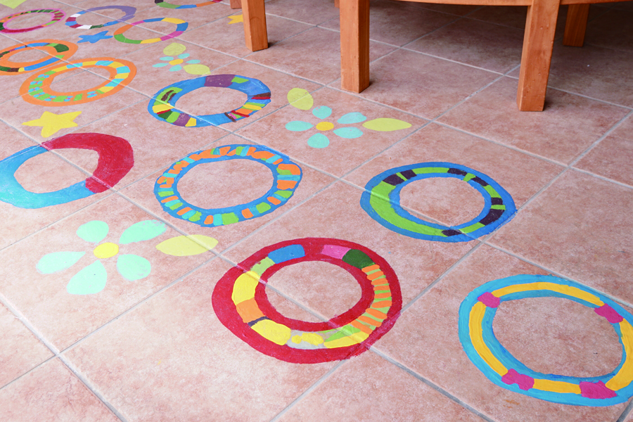 年少・年中クラスの取り組みとして、園庭で小枝や石、どんぐりなどを使って文字や絵を書く遊びをし年長の活動に向けていきます。